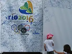 Uma menina acrescenta sua assinatura em apoio à candidatura do Rio de Janeiro.