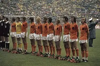 Com a base titular da Seleção formada pelos jogadores dos continentalmente vitoriosos Feyenoord (Wim Jansen, Willem van Hanegem e Wim Rijsbergen) e Ajax (Arie Haan, Ruud Krol, Johan Neeskens, Johnny Rep e Wim Suurbier, além do próprio Cruijff, já barcelonista no mundial), que no período entre 1970 e 1974 deixaram a taça da Copa dos Campeões da UEFA nos Países Baixos,[carece de fontes] o conjunto, ainda que desunido - os jogadores de um time não costumavam conversar com os do rival,[27] e Cruijff não esconderia isso no livro Futebol Total, que ele publicaria ainda naquele ano[28] — finalmente obteve a classificação para a Copa do Mundo de 1974. Cruijff, já treinado por Rinus Michels no Barcelona, o seria também na Oranje na competição. O treinador não hesitou em transportar para a Seleção o rodízio que funcionara bem no Ajax de ambos. O chamado "futebol total" do Ajax transfomar-se-ia para os olhos do mundo no "Carrossel Holandês" no torneio:[8] um grupo de grande talento que trouxe inovações para a época como a valorização da troca de passes e posse de bola, a linha defensiva de impedimento e marcação firme,[29] tentando roubar a bola ainda na intermediária adversária.[30]