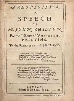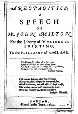 - ↑ «Milton's Areopagitica and the Modern First Amendment by Vincent Blasi» (em inglês). Nationalhumanitiescenter.org. Consultado em 9 de fevereiro de 2014. Arquivado do original em 14 de dezembro de 2007