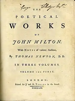 - ↑ Explanatory Notes and Remarks on Milton's Paradise Lost (1734).