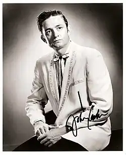 John R. Cash (nascido J.R. Cash; Kingsland, 26 de fevereiro de 1932 – Nashville, 12 de setembro de 2003) foi um cantor e compositor country americano. A maior parte da música de Cash continha temas de tristeza, tribulação moral e redenção, especialmente nos estágios posteriores de sua carreira.[5] Ele era conhecido por sua voz profunda e calma de baixo-barítono,[Nota 1][6] o som distinto de sua banda de apoio do Tennessee Three, caracterizado por ritmos de guitarra vibrantes, uma rebeldia[7][8] juntamente com um comportamento cada vez mais sombrio e humilde,[9] concertos gratuitos na prisão,[10] e um guarda-roupa de palco todo preto, que lhe rendeu o apelido de "Homem de Preto".[Nota 2]