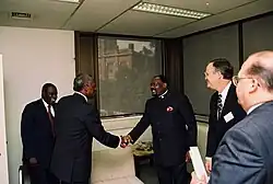 Aperto de mãos entre José Eduardo dos Santos e Savimbi em 1995 durante conversações para um acordo de paz.