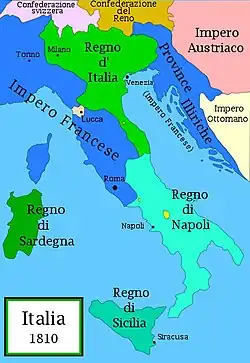 Itália Napoleônica em 1810, com Nápoles sendo da mesma extensão sob Joseph (1806–1808)