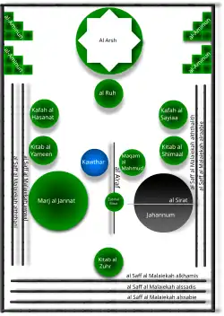 Neste processo, as almas vão passar pelo fogo do inferno[10] através da ponte de sirat. Para os pecadores, essa ponte será fina e afiada como espada mais afiada até que caiam no lago de fogo,[11] enquanto os justos passarão pela ponte até o paraíso (Jannah). Os muçulmanos que não passaram pelo juízo ficará no inferno até que seus pecados tenham sido expiados e depois irão ao paraíso, já os que rejeitaram a Deus ficarão lá pela eternidade.[12]