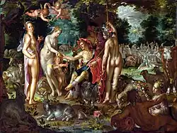 O tema mitológico do julgamento de Páris, naturalmente deu aos artistas a oportunidade de representar uma espécie de concurso de beleza entre três belas mulheres nuas , mas o mito, pelo menos desde Eurípides, tem sido visto como uma escolha entre os dons que cada deusa encarna. O suborno envolvido é irônico e o ingrediente final.