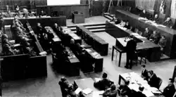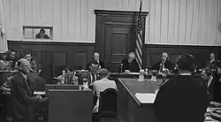 ![]() Banco de juízes durante o tribunal no Palácio da Justiça em Nuremberg, na Alemanha ocupada pelos Aliados | |