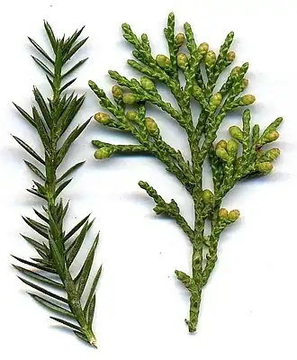 Muitas espécies de Juniperus, entre as quais J. chinensis e J. virginiana, apresentam dimorfismo foliar, com dois tipos morfológicos de folhas bem distintos: (1) as plantas jovens e alguns ramos juvenis apresentam folhas aciculares (em forma de agulha) com 5–25 milímetros de comprimento; e (2) as folhas na plantas maduras são maioritariamente pequenas escamas, com 2–4 milímetros de comprimento, imbricadas e fortemente aderentes aos caules. Nestas espécies, quando a folhagem do tipo juvenil ocorre em plantas adultas, em geral instala-se em rebentos jovens situados em partes ensombradas da planta, com a folhagem adulta presente nas partes com melhor insolação. As folhas em rebentos de crescimento rápido apresentam por vezes características intermédias entre as folhagens juvenil e adulta.