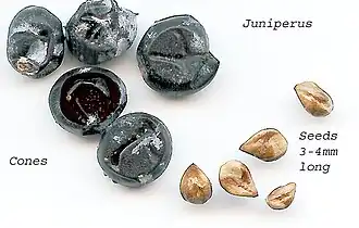 - Juniperus secção Juniperus subsecção Juniperus: Cones com três sementes separadas; agulhas com uma faixa estomática.