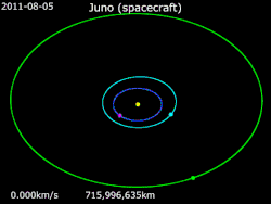 Juno é uma sonda espacial da NASA atualmente orbitando o planeta Júpiter. Foi lançada do Cabo Canaveral, na Flórida, em 5 de agosto de 2011, sobre um foguete Atlas V, e entrou em uma órbita polar ao redor do planeta em 5 de julho de 2016.[7][8] Esta é a primeira vez que Júpiter será visto abaixo da cobertura densa de nuvens. Por isso o nome Juno, uma homenagem à deusa romana que era esposa de Júpiter.[9] No dia 30 de abril de 2016, deu-se a ela o retroacrônimo de "JUpiter Near-polar Orbiter", que foi incluso na lista de acrônimos da NASA.[10] Seu objetivo primário será investigar a origem e evolução de Júpiter, e, por extensão, do Sistema Solar. Para isso, possui nove instrumentos científicos, que vão estudar a composição do planeta, sua distribuição de massa, atmosfera, campos gravitacionais e magnéticos e as regiões polares da magnetosfera jupiteriana.[8]
