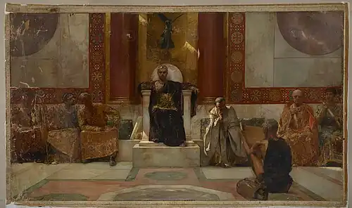 Uma pintura do artista francês Jean-Joseph Benjamin-Constant do século XIX retratando o Imperador Bizantino Justiniano e os seus conselheiros empenhados numa discussão de textos religiosos