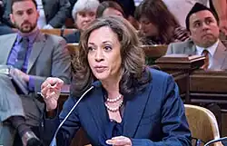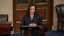 Após sua eleição para o Senado, Harris anunciou sua intenção de permanecer como procuradora-geral da Califórnia até o final de 2016 e renunciou pouco antes de ser empossada como senadora em 3 de janeiro de 2017, sendo substituída pelo representante democrata Xavier Becerra, nomeado por Brown.[134][135] Ao ser empossada, tornou-se a primeira senadora norte-americana de origem indiana e afro-americana, e a segunda mulher afro-americana a integrar o Senado.[136][137][138][139] Os democratas inicialmente a indicaram para os comitês do Orçamento, Segurança Interna e Assuntos Governamentais e Inteligência, mas em janeiro de 2018 o líder democrata Chuck Schumer a designou para o Comitê do Judiciário, tornando-se um de seus primeiros membros afro-americanos.[140][141][142]