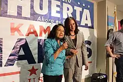 Em 7 de junho, Harris ficou em primeiro lugar na eleição primária, com 39,9% dos votos, avançando para a eleição geral com a representante democrata Loretta Sanchez, que atingiu 18,9%. Harris ganhou em 48 dos 58 condados, dos quais sete com mais de 50% dos votos: Alameda, Contra Costa, Marin, São Francisco, San Mateo, Santa Cruz e Sonoma. O maior percentual foi em São Francisco, com 70,4% dos votos.[126][127] Em 19 de julho, foi endossada pelo presidente Barack Obama e pelo vice-presidente Joe Biden.[128][129] Em 8 de novembro, derrotou Sanchez, obtendo 7,5 milhões de votos (61,6%), contra 4,7 milhões (38,4%) de sua opositora; Harris venceu em 54 condados.[130] No discurso de vitória, prometeu proteger os imigrantes das políticas do presidente eleito Donald Trump.[131][132][133]