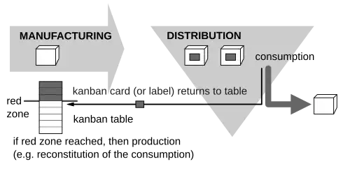 O sistema movimenta e fornece itens de acordo com o consumo, fazendo com que não haja abastecimento de materiais sem solicitação. O Kanban foi baseado num sistema visual de abastecimento de um supermercado: conforme os produtos vão sendo vendidos (consumidos), os espaços vazios vão sendo reabastecidos.