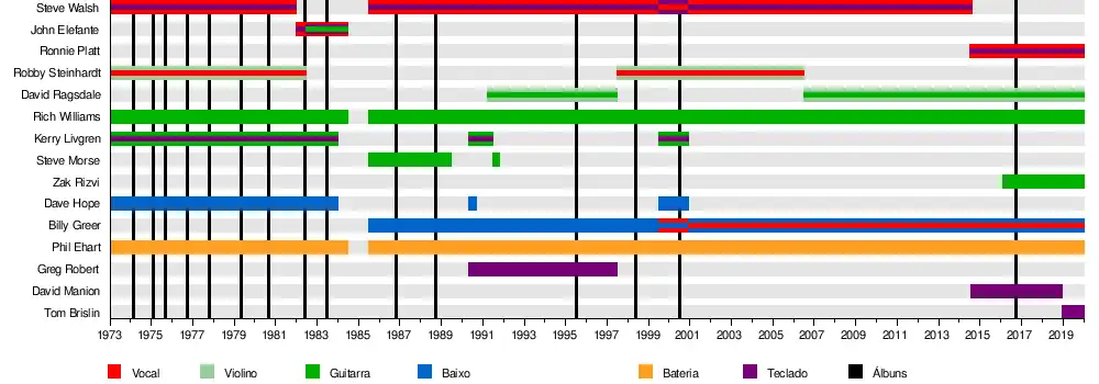 | Ex-integrantes | Steve Walsh, Kerry Livgren, Robbie Steinhardt, Dave Hope, John Elefante, Steve Morse, Greg Robert, David Manion |