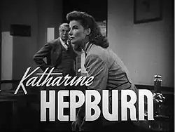 Katharine Houghton Hepburn (Hartford, 12 de maio de 1907 — Fenwick, 29 de junho de 2003) foi uma atriz estadunidense. A carreira de Hepburn em Hollywood durou mais de 60 anos. Ela era conhecida por sua independência obstinada, personalidade espirituosa e franqueza, cultivando uma personalidade de tela que combinava com essa imagem pública, o que a fez interpretar regularmente mulheres sofisticadas e com muita força de vontade. Seu trabalho foi em uma variedade de gêneros, indo da comédia ao drama literário, o que lhe rendeu vários feitos, incluindo quatro prêmios Oscar (todos de melhor atriz – mais do que qualquer outro artista),[1] um Emmy e indicações para um Grammy e dois Prêmios Tony; o que a torna uma das poucas artistas a receber indicações para todos os quatro principais prêmios de entretenimento. Em 1999, Hepburn foi eleita pelo Instituto Americano de Cinema como a maior estrela feminina do cinema clássico de todos os tempos.[2]