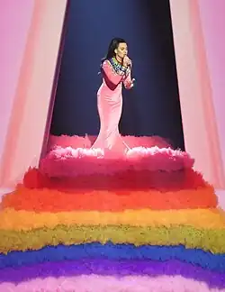 Fora do âmbito musical, Perry apareceu como ela mesma no filme Zoolander 2, lançado em fevereiro de 2016.[177][178] Em fevereiro de 2017, a cantora lançou uma linha de calçados intitulada "Katy Perry Collections".[179] Seus sapatos estão disponíveis em seu website, Katy Perry Collections, e em varejistas como Dillard's e Walmart.[180] Em agosto seguinte, ela apresentou o MTV Video Music Awards de 2017.[181] Perry foi contratada por um salário de US$ 25 milhões para atuar como jurada na nova versão do talent show American Idol na rede de televisão ABC, que estreou em março de 2018.[182][183] Perry iniciou um relacionamento com Orlando Bloom no início de 2016; o casal ficou noivo em 14 de fevereiro de 2019.[184][185]