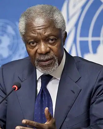 Kofi Atta Annan GColL (Cumasi, 8 de abril de 1938 – Berna, 18 de agosto de 2018) foi um diplomata ganês.[2][3] Foi, entre 1 de janeiro de 1997 e 31 de dezembro de 2006, o sétimo secretário-geral da Organização das Nações Unidas, tendo sido laureado com o Nobel da Paz em 2001. Annan e as Nações Unidas foram correceptores do Prêmio Nobel da Paz de 2001 pela criação do Fundo Global de Luta contra Aids, Tuberculose e Malária para ajudar países em desenvolvimento em seus esforços para cuidar de seu povo.[4][5]