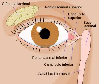 As glândulas lacrimais secretam fluidos, que fluem pelos canais excretores principais, para o espaço entre o globo ocular e as pálpebras. Quando os olhos piscam, os fluidos lacrimais se espalham por toda a superfície do olho. Esses fluidos se juntam no lago lacrimal, e são sugados para dentro do ponto lacrimal, seguindo, então, por canalículos lacrimais, entrando num reservatório chamado de saco lacrimal. Posteriormente são levados pelo ducto nasolacrimal e, finalmente, chega na cavidade nasal. Situações de produção lacrimal excessiva, como o choro, podem causar um corrimento do nariz. Basicamente existem tipos quanto a classificação das secreções lagrimais, sendo elas: