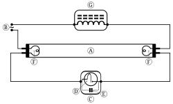 Circuito de uma lâmpada fluorescente A: Tubo Fluorescente, B: Energia eléctrica (+220 Volts), C: Arrancador, D: Interruptor (Termostato Bimetálico), E: Capacitor/Condensador, F: Filamentos, G: Balastro)