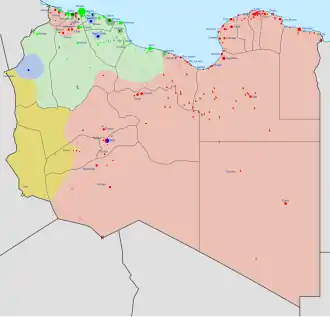 A "libertação" da Líbia foi oficialmente proclamada em 23 de outubro de 2011, apesar de lutas sectárias ainda estarem sendo reportadas. Ao menos 30 mil pessoas foram mortas no conflito.[31] Com a derrocada de Muamar Gadafi do poder, após 40 anos de governo, e com o fim da guerra civil, o país passou a ser oficialmente uma república parlamentarista.[32]