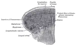 A superfície superior da língua é coberta por mucosa mastigatória, um tipo de mucosa oral, que é um epitélio escamoso estratificado queratinizado. Nela estão embutidas numerosas papilas linguais, algumas das quais abrigam as papilas gustativas e seus receptores gustativos.[9] As papilas linguais consistem em filiformes, fungiformes, valadas e papilas foliadas,[5] e apenas as papilas filiformes não estão associadas a papilas gustativas.