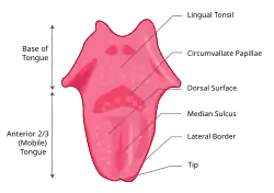 A língua pode se dividir em superfície dorsal e ventral. A superfície dorsal é um epitélio escamoso estratificado queratinizado, caracterizado por numerosas projeções mucosas chamadas papilas.[10] As papilas linguais cobrem o lado dorsal da língua em direção à frente do sulco terminal. A superfície ventral é um epitélio escamoso estratificado não queratinizado, que é liso.[11]