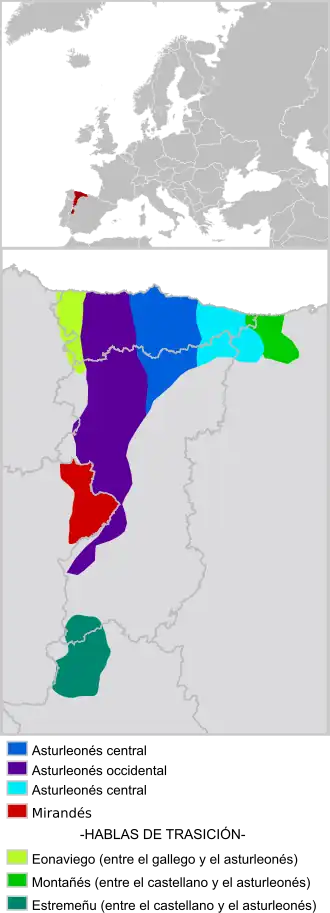 O asturiano pertence ao conjunto asturo-leonês ocidental das línguas românicas. Tradicionalmente divide-se em três grandes variedades regionais:[16][17]