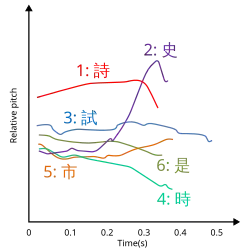 - ↑ Bauer, Robert S.; Kwan-hin, Cheung; Pak-man, Cheung (julho de 2003). «Variation and merger of the rising tones in Hong Kong Cantonese». Language Variation and Change (em inglês) (2): 211–225. ISSN 1469-8021. doi:10.1017/S0954394503152039. Consultado em 22 de abril de 2021