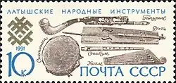 Selo postal da URSS representando instrumentos letões tradicionais.