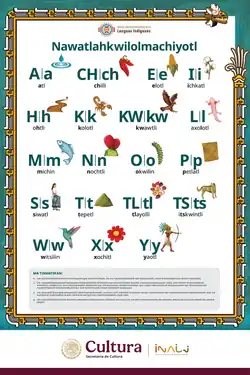 Alfabeto ilustrado da língua náuatle ou mexicano.