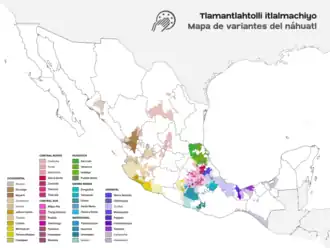 Hoje em dia, os dialetos náuatles[7] são falados em comunidades espalhadas na sua maior parte em áreas rurais. Existem diferenças consideráveis entre cada dialeto e alguns são mutuamente ininteligíveis. Todas sofreram diferentes graus de influência do castelhano. Nenhum dialeto moderno é idêntico ao náuatle clássico, mas aqueles que são falados no vale do México e em seus arredores são geralmente considerados como mais próximos, linguisticamente, a ele.[8] Sob a Ley General de Derechos Lingüísticos de los Pueblos Indígenas ("Lei Geral de Direitos Linguísticos dos Povos Indígenas"), promulgada no México em 2003,[9] o náuatle, assim como outras línguas indígenas do México foram reconhecidas como lenguas nacionales ("línguas nacionais") nas regiões onde são faladas, ostentando o mesmo statu que o castelhano.[10]