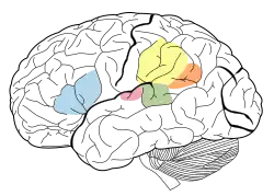 A área de Wernicke, em verde, e a área de Broca, em azul claro. Alguns cientistas argumentam que essas áreas possuem forte relação com a linguagem humana