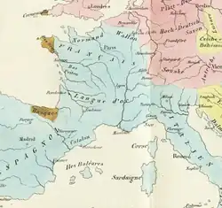 - presença de zonas de separação entre as populações: zonas ultra secas,[37] florestas densas que separam o norte e o sul da França exceto nas áreas próximas aos grandes corpos de água; pantanais ou terras pouco adequadas a usos agrícolas; e grupos hostis a tentativas de colonização exterior (regiões entre o Loire e Garona, planalto desértico aragonês).