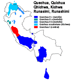 O quíchua era falado na região central dos Andes antes da formação do Império Inca, o qual adotou-a como oficial da administração. Ainda é falado hoje, na forma de vários dialetos, sendo o idioma nativo mais falado na América do Sul. Sua influência distribui-se no Peru, centro e sudoeste da Bolívia, sul da Colômbia e do Equador, norte da Argentina e norte do Chile.