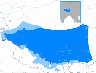 O chamado “grande tibetano”, um idioma que englobaria todos dialetos e formas, é falado por cerca de seis milhões de pessoas no “Plateau” tibetano. O tibetano Lhasa apresenta 150 mil falantes que são exilados vivendo hoje na Índia e em alguns outros países. O tibetano é também falado por minorias de outras etnias que por séculos viveram nas proximidades do Tibete, mas que também falam suas próprias línguas e mantém suas culturas. Os povos Qiangic dos grupos Kham são considerados pelo governo da República Popular da China como tibetanos étnicos, mas os seus idiomas não são geralmente aceitos como dialetos da língua tibetana, mas preferencialmente como parte de um outro ramo das línguas Sino-Tibetanas.