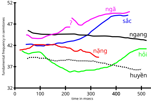 O tom é indicado por sinais diacríticos escritos acima ou abaixo da vogal (5 dos 6 diacríticos de tom aparecem acima da vogal. No entanto, o diacrítico de tom Nang, um ponto, fica abaixo da vogal).[4] Os diacríticos são oriundos, obviamente, de alguns do alfabeto latino. Os seis tons nas variedades do norte (de Hanoi), com os respectivos nomes vietnamitas auto-referenciados, são: