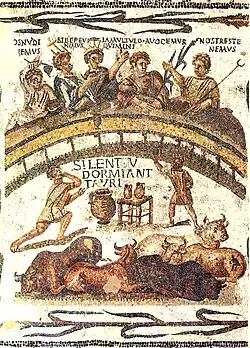 As certidões de nascimento e testamentos dos cidadãos romanos eram obrigatoriamente escritos em latim até ao reinado de Alexandre Severo (r. 222–235).[31] Os romanos analfabetos recorriam a alguém, como escribas do governo (scriba), para ler ou escrever os seus documentos oficiais.[32][33] As leis e éditos eram publicados por escrito e também eram anunciados oralmente.[34][nt 1] A arte pública e as cerimónias religiosas eram formas de comunicar a ideologia imperial, independentemente da língua falada ou da capacidade de leitura.[35] Os artistas gregos levaram para Roma uma forma primitiva de dança narrativa (pantomimo) que se tornou popular por todo o império multilíngue, em parte porque se baseava mais em gestos do que na expressão verbal.[36]