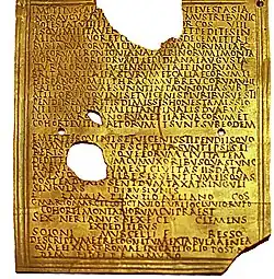 A leis romanas eram escritas em latim e a "letra da lei" estava estritamente ligada às palavras nas quais era expressa.[182] Contudo, qualquer língua podia ser usada em contratos verbais e procedimentos jurídicos mais genéricos baseados em jus gentium (direito romano aplicado a estrangeiros) ou leis internacionais.[183] O jus gentium não era um código legal escrito, mas pensa-se que existiu entre todos os povos como forma de direito natural. Os juristas romanos mostraram interesse pelas línguas locais como o púnico, gaulês e aramaico para se assegurarem do correto entendimento e aplicação de leis e contratos.[134]