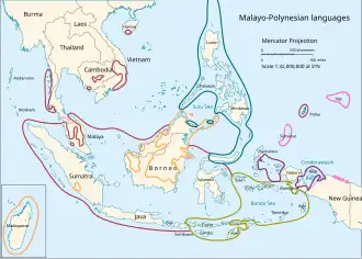 ![]() Principais ramos das línguas malaio-polinésias: Em laranja o grupo borneano-filipino (não mostrado: yami, falando em Taiwan) Em verde o grupo malaio-polinésio central (ou nuclear), em roxo o grupo de Halmahera-Baía de Geelvink, e em rosa as línguas malaio-polinésias orientais. | |