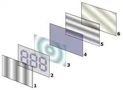 Um LCD consiste de um líquido polarizador da luz, eletricamente controlado, que se encontra comprimido dentro de celas entre duas lâminas transparentes polarizadoras. Os eixos polarizadores das duas lâminas estão alinhados perpendicularmente entre si. Cada cela é provida de contatos eléctricos que permitem que um campo elétrico possa ser aplicado ao líquido no interior.