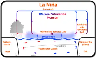 Os ventos ascendentes no Pacífico Central e Ocidental, descendentes no oeste da América do Sul, alísios (de leste para oeste) próximos à superfície e de oeste para leste em altos níveis da troposfera correspondem à chamada Célula de Walker, área de constante evaporação que regula o padrão de circulação da convecção originada sobre o oceano. Em situações normais, as águas mais quentes do Pacífico Equatorial Oeste são represadas pela intensificação dos ventos alísios. Com o La Niña, o afloramento aumenta e a termoclina se torna mais rasa a leste do Pacífico, ao mesmo tempo em que as águas quentes são represadas mais a oeste que o normal, alongando a Célula de Walker.[3][4][5]