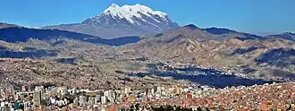 La Paz (pronunciado em português europeu: [la paʃ]; pronunciado em português brasileiro: [la pas]; pronunciado em castelhano: [la pas]; em aimará-Chuqi Yapu), oficialmente conhecida como Nuestra Señora de La Paz, é uma das capitais da Bolívia e é a sede do governo do Estado Plurinacional da Bolívia. Com uma estimativa de 816.044 residentes em 2020,[2] La Paz é a terceira cidade mais populosa da Bolívia. Sua área metropolitana é a segunda área urbana mais populosa do país, com uma população de cerca de 2 milhões de habitantes, depois de Santa Cruz de la Sierra com uma população de 2,3 milhões de pessoas.[2] É também a capital do Departamento de La Paz. A cidade, localizada no centro-oeste boliviano cerca de 68 quilômetros a sudeste do Lago Titicaca, está situada em um desfiladeiro criado pelo rio Choqueyapu e em uma depressão em forma de tigela, parte da bacia amazônica, cercada pelas altas montanhas do Altiplano. Com vista para a cidade está o imponente Illimani, de três picos. Seus picos estão sempre cobertos de neve e podem ser vistos de vários pontos da cidade. A uma altitude de aproximadamente 3.650 metros acima do nível do mar, La Paz é a capital mais alta do mundo.[3][4] Devido à sua altitude, La Paz possui um clima subtropical de terras altas incomum, com verões chuvosos e invernos secos.