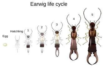As ninfas de dermápteros normalmente possuem poucas características que permitem sua identificação, entretanto, é possível notar o abdômen dividido em dez segmentos visíveis, apresentando linhas ecdisiais (também chamadas de "linhas de muda") quase brancas que também podem ser encontradas no tórax. Os cercos normalmente são retos e de comprimento variável. Após a eclosão, a ninfa passa por quatro a seis estágios (instares) morfologicamente semelhantes ao indivíduo adulto, sendo que nos dois ou três primeiros instares ainda é possível observar cuidado materno.[1] A fase ninfal dura, em média, 40 dias e as mudas periódicas entre os instares permitem o aumento de tamanho do indivíduo até que ele atinja a fase adulta.