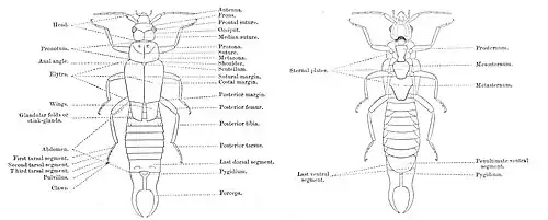 - 1 2 Meyer, John (28 de março de 2016). «General Entomology: Dermaptera». Universidade Estadual da Carolina do Norte. Consultado em 21 de maio de 2018