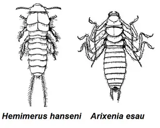 A subordem Arixeniina contém a família Arixeniidae,[1] com dois gêneros (Arixenia e Xeniaria) e cinco espécies .As espécies dessa subordem vivem em associação com morcegos do sudeste asiático.[2][11] Sua alimentação se baseia em células mortas da pele de seu hospedeiro assim como suas secreções glandulares, porém podem ser encontrados no guano em cavernas ou árvores. O comprimento de seu corpo pode chegar a 25 mm, com pernas longas, possuem olhos reduzidos, cercos finos com função sensorial e não possuem asas.[11]
