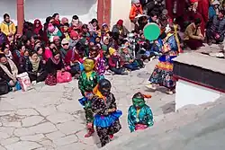 Os maiores festivais são os dos mosteiros budistas (gompas). A maior parte dos mosteiros budistas, senão todos, pelo menos os mais importantes, celebram todos os anos pelo menos um festival, que incluem várias cerimónias,[71][73] entre elas danças cham, realizadas por monges envergando roupas de seda muito coloridas e máscaras sagradas, geralmente de aspeto temível. Os monges executam peças de mímica e dança que representam aspetos religiosos, como o progresso da alma e a sua purificação ou o triunfo do bem sobre o mal.[74] Devido à sua popularidade entre os turistas, alguns dos festivais monásticos, que originalmente eram realizados noutras alturas do ano, foram movidos nos últimos anos para o verão, a época alta do turismo (há muito poucos turistas no resto do ano devido ao frio e às muitas estradas encerradas devido à neve).[73] Os festivais dos mosteiros atraem multidões de locais, tanto das proximidades como de longe, e também muitos turistas. O ambiente é efusivo e as pessoas aproveitam a oportunidade para rever os amigos e fazer novas amizades.[74]