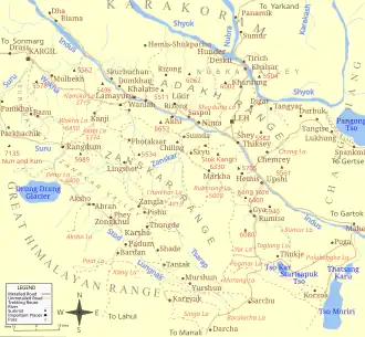 Mapa do Ladaque sem o Aksai Chin (a nordeste) nem a área do glaciar de Siachen (a norte)