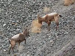 Outro carneiro selvagem de montanha único que vive nas montanhas do Ladaque é o urial ladaque, cuja população tem vindo a diminuir, não ultrapassando os 3 000 indivíduos em 2006.[19] O urial é endémico do Ladaque, onde se distribui apenas ao longo de dois vales importantes: o do rio Indo e o do rio Shyok. O animal é frequentemente perseguido por agricultores, cujas colheitas são alegadamente danificadas por ele. A sua população diminuiu abrutamente desde o início do século XX devido a caça indiscriminada ao longo da estrada Serinagar–Lé. O argali-tibetano ( Ovis ammon hodgsonii) é o maior carneiro selvagem do mundo, chegando a ter 1,20 metros à altura do dorso e cornos com 90 a 100 cm. Vive no planalto tibetano e nas montanhas que o bordejam, numa área de 2,5 milhões de km². No Ladaque há uma pequena população de 400 animais. Ao contrário das cabras-montesas, que sobem escarpas muito íngremes para escapar aos predadores, o argali-tibetano prefere fazê-lo correndo em terreno aberto ou ondulado.[20]