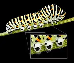 A cabeça da lagarta é constituída por uma cápsula resistente e esclerosada. Na maioria das espécies, a cabeça é formada por dois hemisférios, entre os quais se insere uma testa triangular. Os órgãos visuais das lagartas são estemas,[6] também denominados ocelos larvais e que, apesar do nome, não são homólogos aos ocelos.[7] Esses órgãos se localizam na cabeça em uma série de seis estemas, cada um com numerosos fotorreceptores e células nervosas associadas. Em geral, os estemas possuem alta sensibilidade à luz, mas com um poder de resolução relativamente baixo. Algumas lagartas aumentam seu campo de visão e preenchem as lacunas entre as direções detectadas por estemas adjacentes por movimentos exploratórios da cabeça.[6][8]