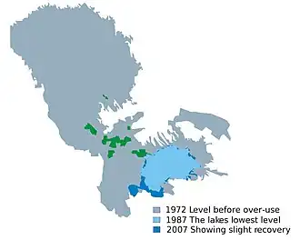 - ↑ Ross, Will (31 de março de 2018). «Can the vanishing lake be saved?». BBC (em inglês). Consultado em 28 de janeiro de 2019. Arquivado do original em 9 de agosto de 2019